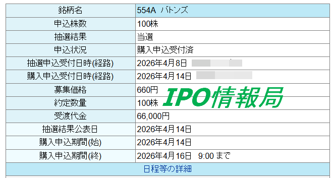 バトンズ当選 公開日:2026-04-14 ipo当選 バトンズが主幹事大和証券で当選しました。 4人中、1人だけ当選しました。 久々の当選なので初値高騰を願っています。 関連記事 北里コーポレーション(368A)上場、寄り付きましたIPO技術承継機構(319A)当選しましたアクセルスペースホールディングス(402A)上場 寄付きましたGMOコマース(410A)上場寄り付きましたノースサンド(446A)当選 投稿ナビゲーション ノースサンド(446A)当選